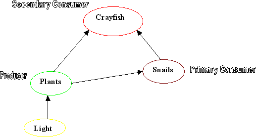- Animals (the crayfish and snails) eat the plants and the plant and animal residues return to the soil (or water) again completing the cycle.