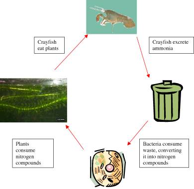 The above picture is a representation of all the major cycles that are occurring within the crayfish environment. For instance, the food chain is exhibited, with the arrow pointing to the crayfish from the plant and the snail. The photosynthesis and respiration cycles are represented by the plants taking in the carbon dioxide produced by the organisms and the organisms consuming the oxygen produced by the plants. The nitrogen cycle is represented by the snail and the crayfish giving off waste, which is consumed by the bacteria and turned into NO2 which is consumed by the plants.